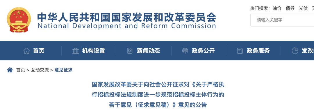 感谢您的参与和支持! 附件:《关于严格执行招标投标法规制度进一步规范招标投标主体行为的若干意见(征求意见稿)》 国家发展改革委 2021年9月30日 国家发展改革委关于向社会征求对《关于进一步规范公共资源交易平台服务行为的若干意见(征求意见稿)》意见的公告