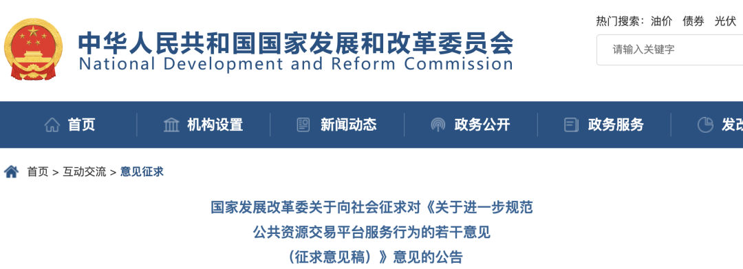 为进一步规范公共资源交易平台服务行为,强化公共资源交易平台的公共服务职能定位,更好保护交易各方主体的合法权益,依照《优化营商环境条例》和《国务院办公厅转发国家发展改革委关于深化公共资源交易平台整合共享指导意见的通知》(国办函〔2019〕41号)有关规定,我们商国务院有关部门和地方研究起草了《关于进一步规范公共资源交易平台服务行为的若干意见(征求意见稿)》,现予公告,向社会公开征求意见。 此次公开征求意见的时间为2021年9月30日至10月30日。欢迎各界人士通过网络、传真等方式提出意见,请登录国家发展改革委门户网站(http://www.ndrc.gov.cn)首页“意见征求”专栏,进入“《关于进一步规范公共资源交易平台服务行为的若干意见》公开征求意见”栏目,提出意见建议。电子邮件请发至luyan@ndrc.gov.cn,传真请发至(010)68502514。 感谢您的参与和支持! 附件:《关于进一步规范公共资源交易平台服务行为的若干意见(征求意见稿)》 国家发展改革委 2021年9月30日