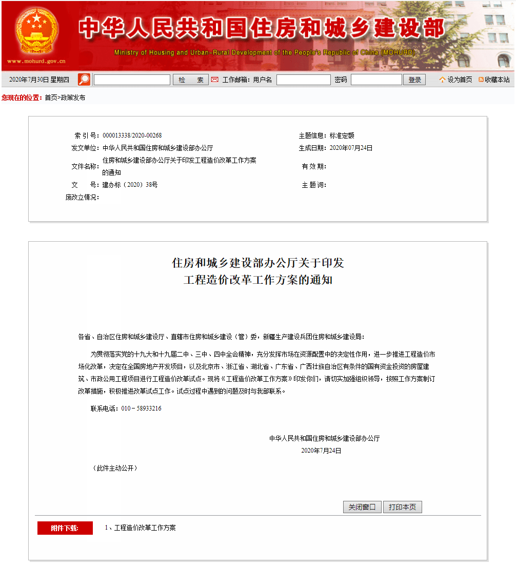 招标采购行业一周要闻(7月27日-8月2日)发表时间:2020-08-05 09:48 01 住建部:取消最高投标限价按定额计价 住房和城乡建设部办公厅印发通知,在全国房地产开发项目以及北京市、浙江省、湖北省、广东省、广西壮族自治区有条件的国有资金投资的房屋建筑、市政公用工程项目进行工程造价改革试点。通知还公布了《工程造价改革工作方案》(以下简称《方案》),提出推行清单计量、市场询价、自主报价、竞争定价的工程计价方式。